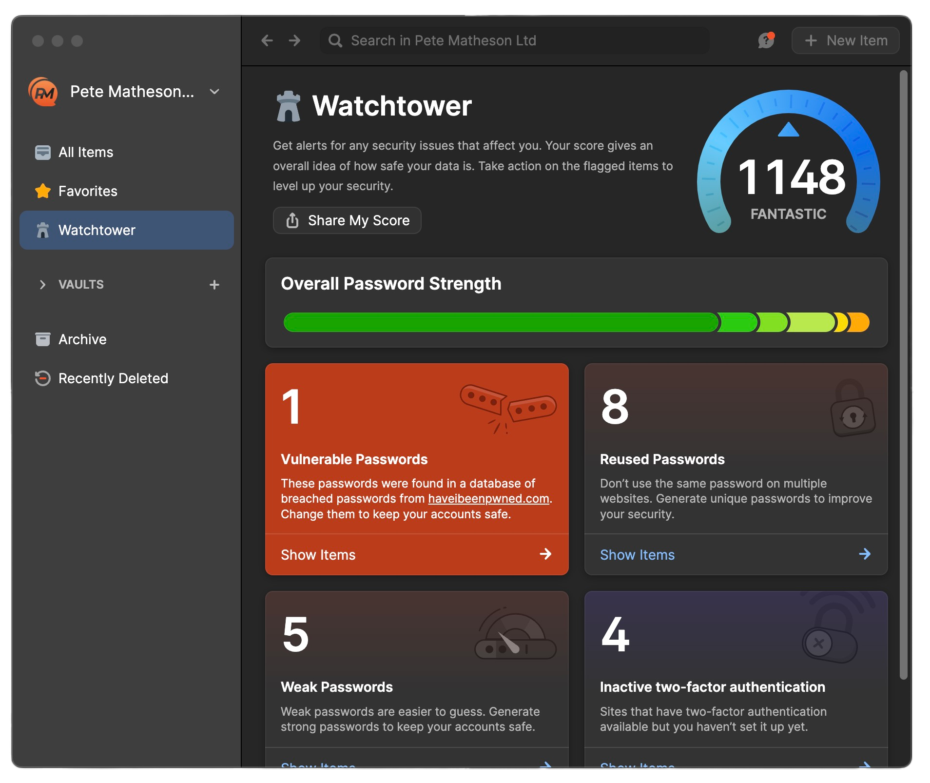 - Watchtower keeps an eye on password breaches and monitors for weak passwords