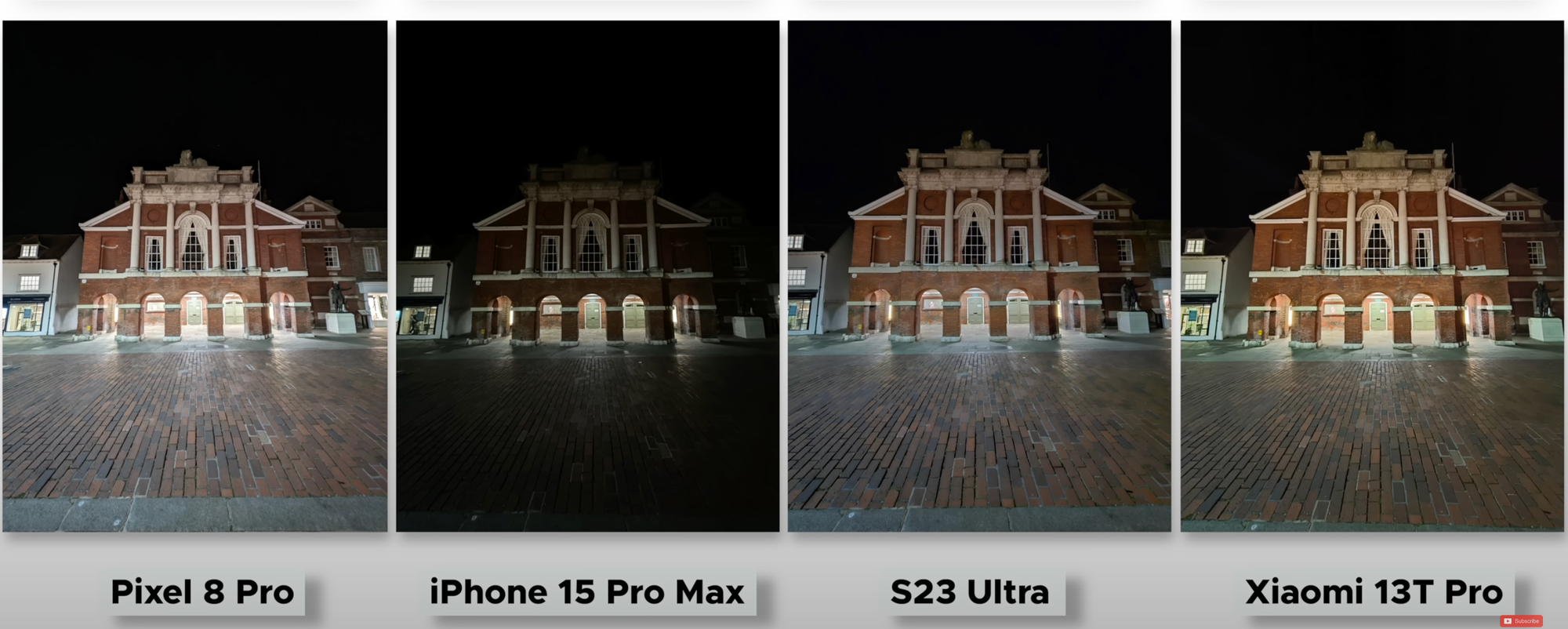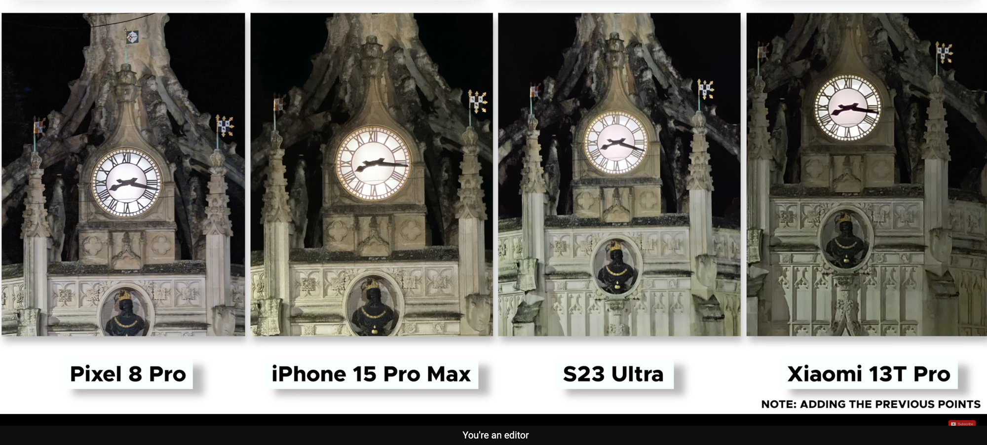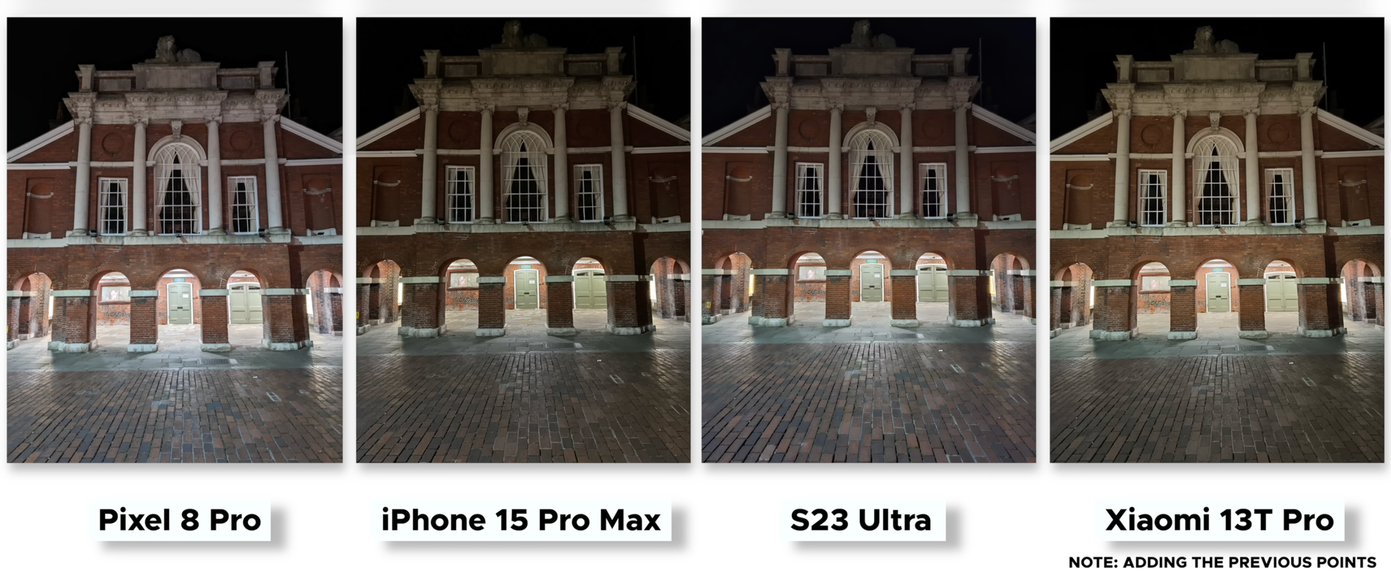 But I’d have to say, of all the 3 remaining shots. I know they’ve made decisions in terms of what to expose for. But the S23 Ultra does look the best in my opinion. It exposed the clock face beautifully. So 4 Points there
