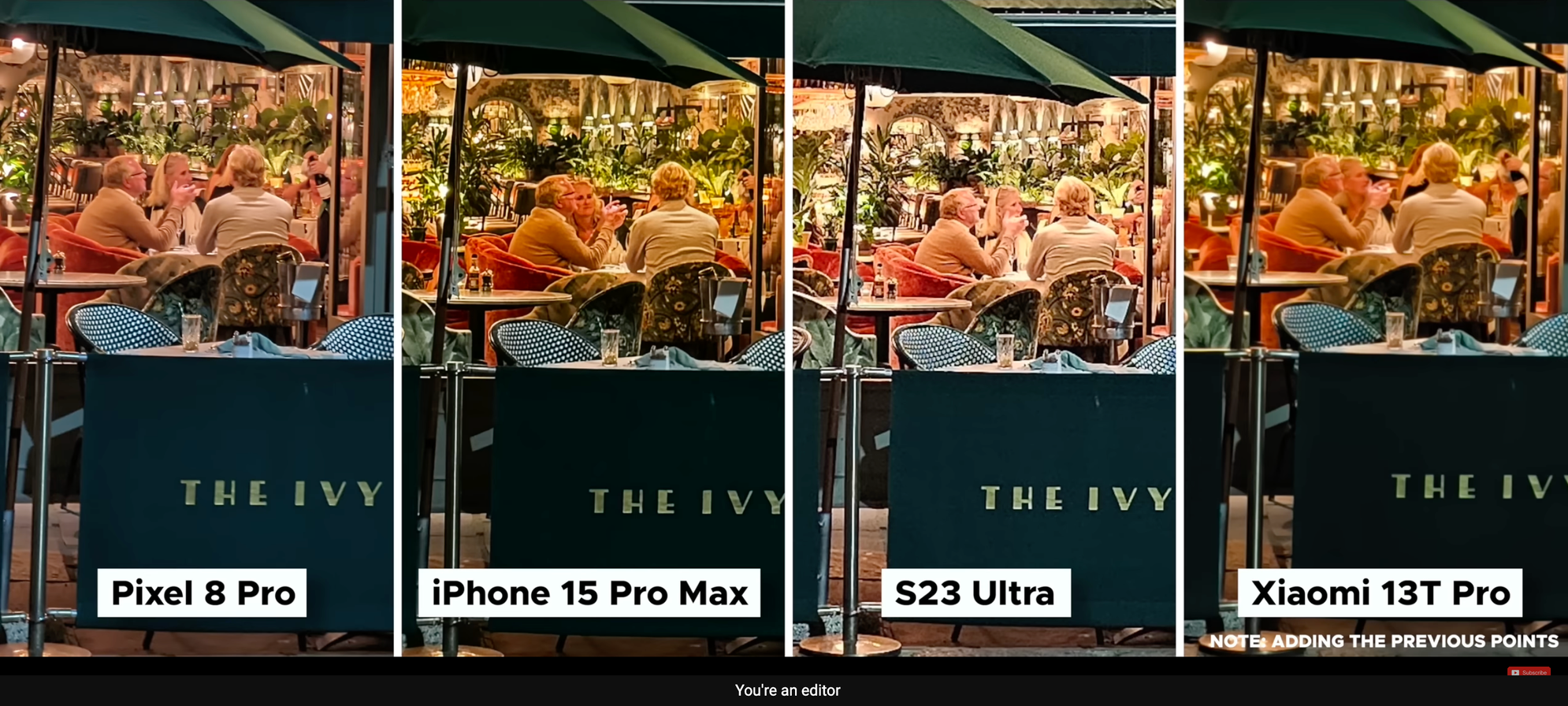 Interestingly, I actually think the Pixel 8 Pro has done the best. BUT it’s oversaturated the image. You’ve got the detail in the Ivy’s sign at the top, the blinds, the contrast with the dark umbrella and there’s very little noise so I'm giving it 4 points.