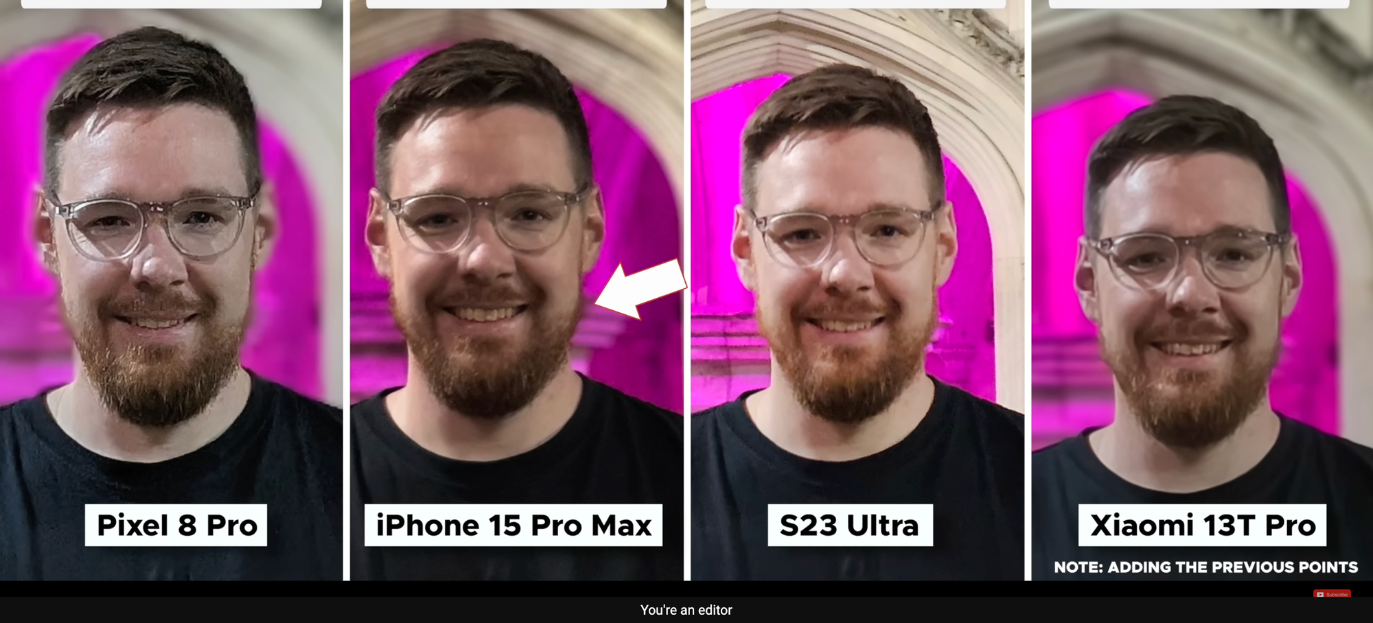 The only bad shot from the 4 here was actually the Pixel 8 Pro. Which totally missed the focus on me, even though the colours were the most accurate in this shot, so I'm going to give that 1 point.