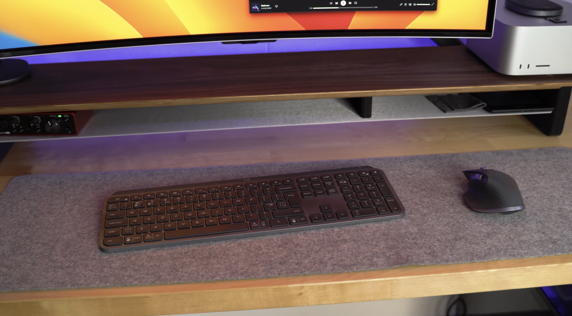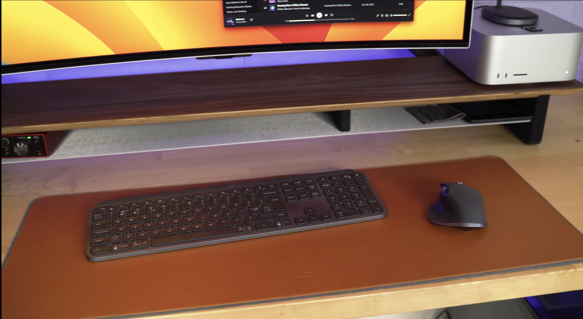 Grovemade sent me a desk shelf that actually perfectly fits both the screen, my Mac Studio, AirPods, and my charger all on top. With neat little cubby holes for things like the remote control, my audio interface, my Kindle, and a few other items.